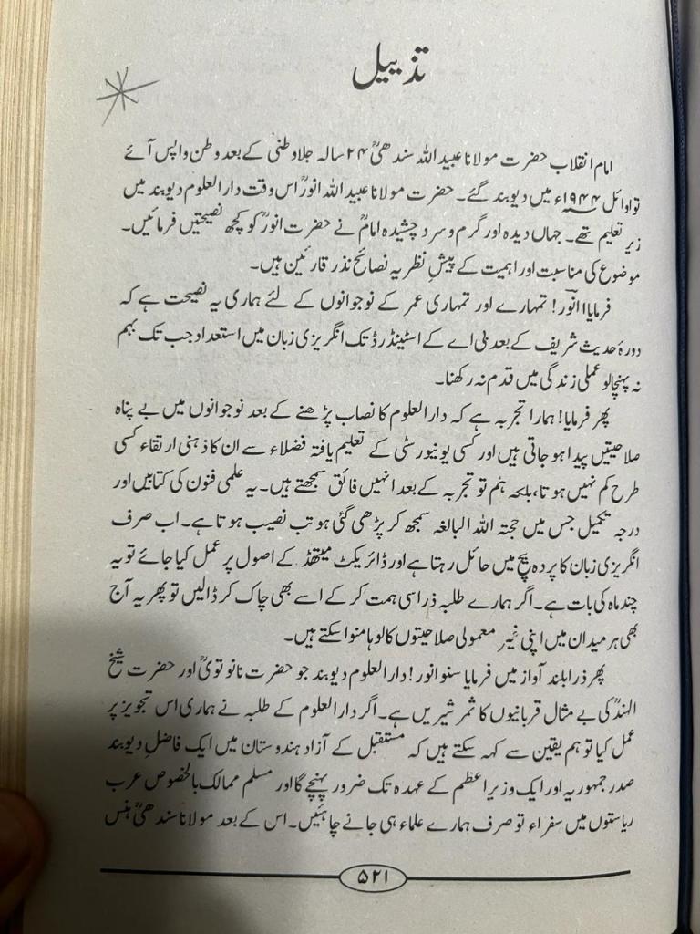 When the Imam of the Revolution, Mawlānā ʿUbayd Allāh Sindhī, may Allah have mercy on him, returned to his homeland after twenty-four years in exile, he visited Deoband in early 1942. At that time, Mawlānā ʿUbayd Allāh Anwar, may Allah have mercy on him, was a student at Dār al-ʿUlūm Deoband. The Imam, seasoned by long experience and acquainted with the trials of life, offered him several counsels. Given their relevance to the present subject, these counsels are presented here for the reader.
