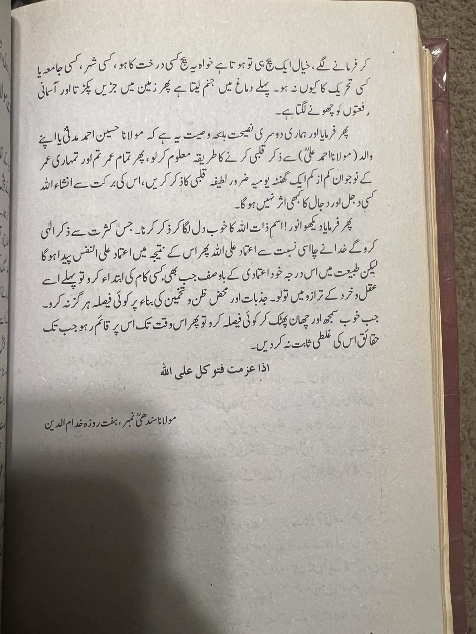 “And our second counsel, rather our bequest, is this: learn the method of internal dhikr (dhikr qalbī) either from Mawlānā Ḥusayn Aḥmad Madanī or from your father, Mawlānā Aḥmad ʿAlī (Lahorī). Then, for the rest of your life, you and the young men of your age should devote at least one hour daily to the dhikr of the laṭifah qalbī (subtle faculty of the heart). By its blessing, God willing, no deception or dajjālī influence will ever overpower you.”